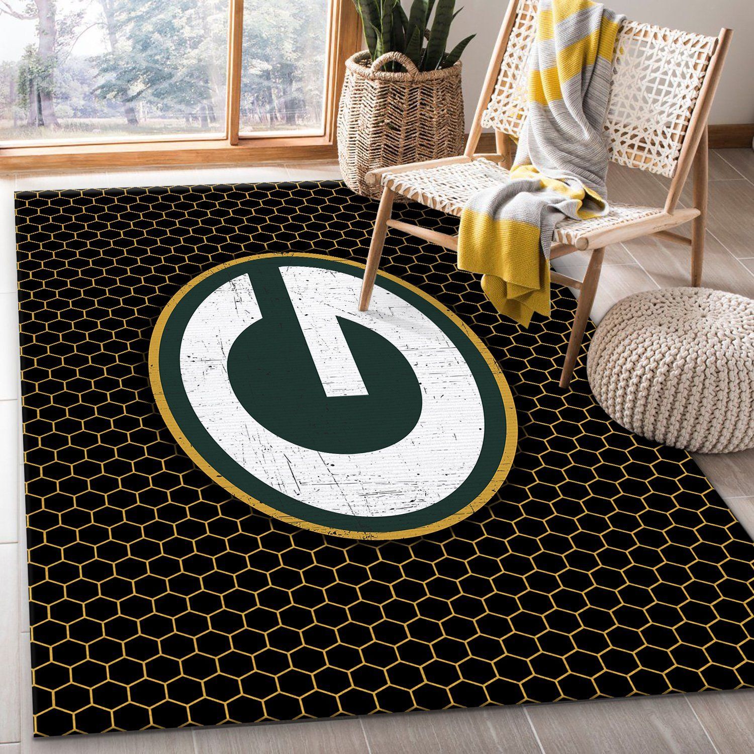 Show off your Green Bay Packers pride every time someone steps through the door with the Black and Yellow Honeycomb Pattern Rug with Large Circular Design! Designed for both sophistication and comfort, this luxurious rug features age-inspired, piece-dyed designs that add depth and character. Turn your living space into a cozy sanctuary with this ultimate home essential!