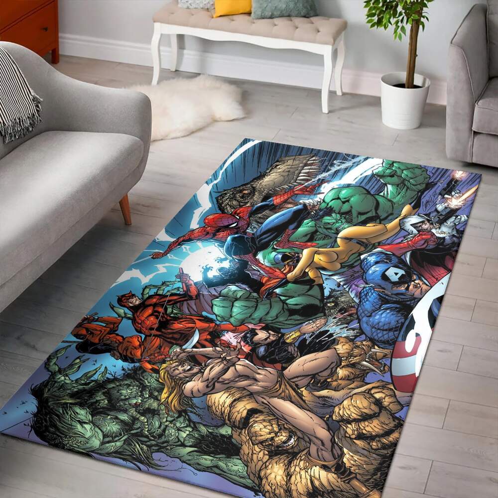Blue and green superhero themed rug for kids bedroom playroom decor