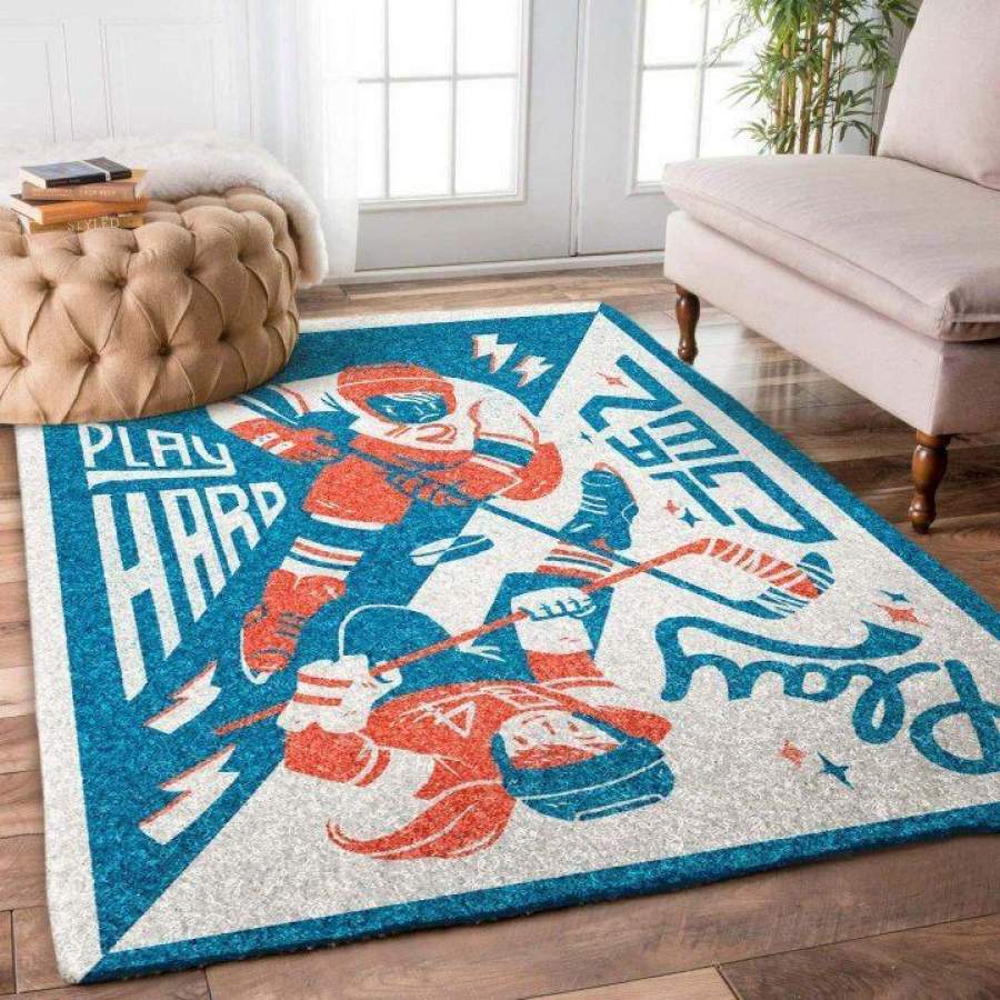 Blue and Orange Hockey Rug Play Hard Sports Design for Kids Room